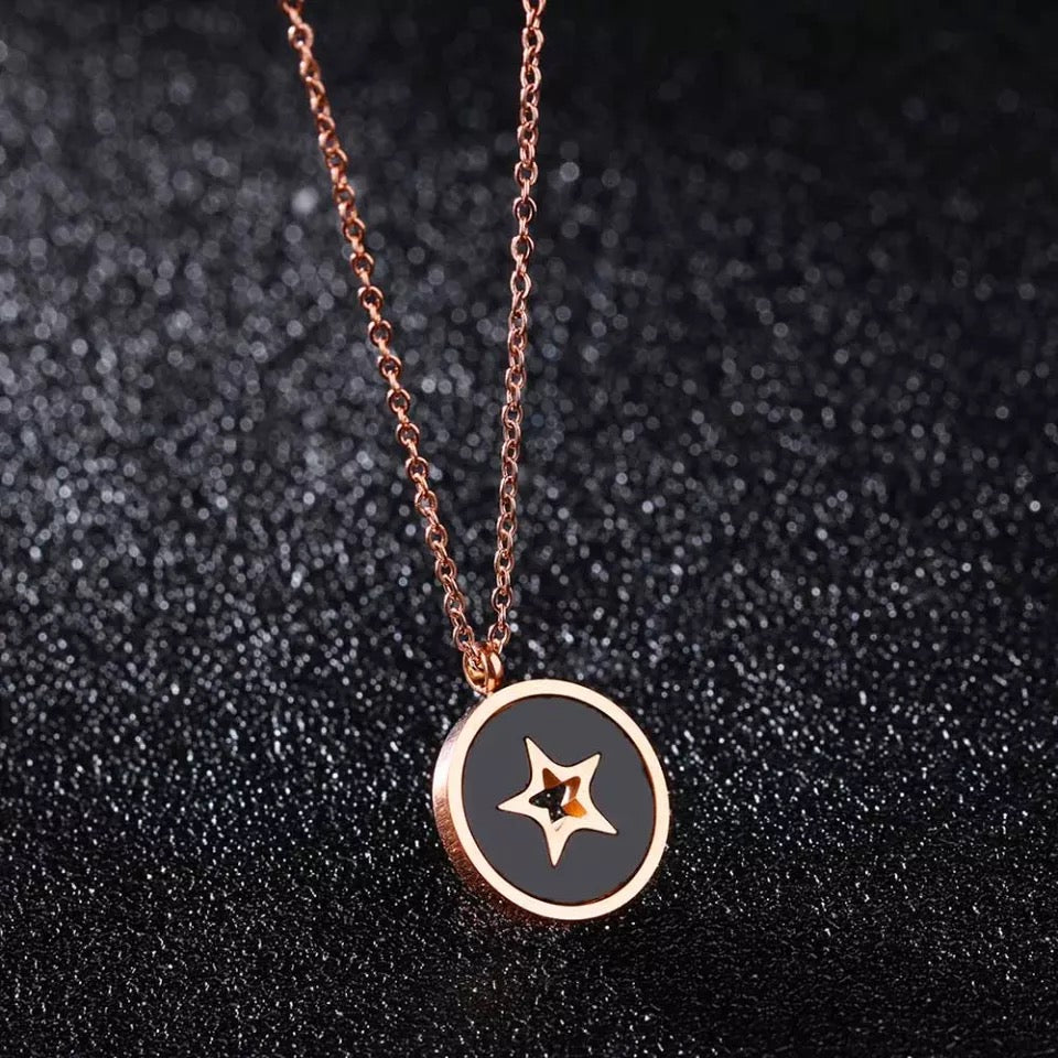 This beautiful necklace is made of stainless steel that is rose gold plated. It has link chain and pedant in a shape of a circle. Pedant is made of a shell and comes in two colours: white and black. The pedant is adorned with little star in rose gold colour. The necklace has adjustable length and lobster clasp.