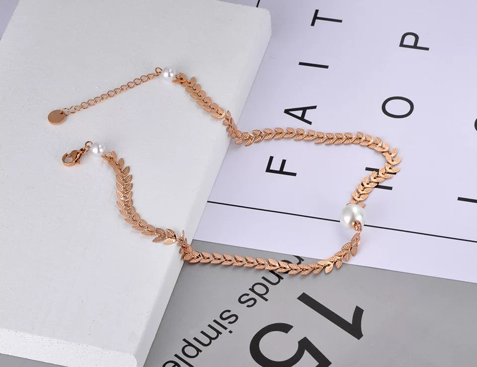 Bohemian stainless steel necklace is coming in rose gold colour and is three times gold plated. It is made of delicate and beautiful chain with links in a shape of leaves. In the bottom it is adorned with white artificial pearl. It makes great accessory for your daily and evening outfits.